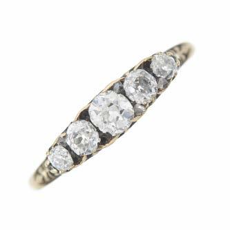 10 A late Victorian 18ct gold old-cut diamond five-stone ring, with rose-cut diamond spacers, estimated total diamond weight 0.75ct, G-H colour, predominantly SI clarity, band stamped 18ct, ring size S, 2.7g £300 - £500