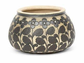 A Martin Brothers stoneware vase, dated 1885, compressed form, incised with a frieze of stylised flower stems, in ochre and white on a buff ground, incised 2-85 Martin Bros, London & Southall, 10cm. diam.