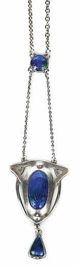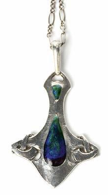 A Charles Horner silver and enamel pendant necklace, shield shape with small drop, enamelled blue and green panels, stamped marks, Chester 1912, 3.5cm. long