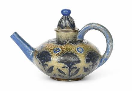 An early Martin Brothers Pottery teapot and cover by Robert Wallace Martin, dated 1879, compressed form with tube handle and spout, incised with stylised flower heads in blue and ochre on a buff ground, incised 20.6.79 R W Martin London & Southall, 15.5cm. high, (2)