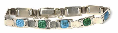 A James Fenton silver and enamel bracelet, rectangular sections enamelled sky blue and green stamped marks, 18.cm long