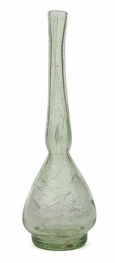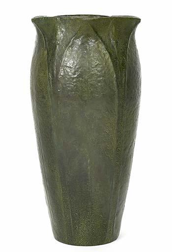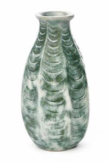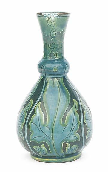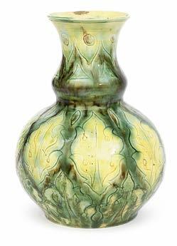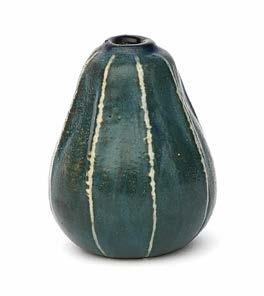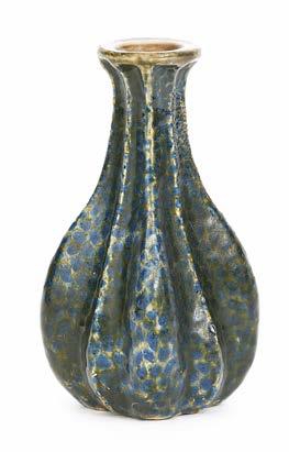 A Martin Brothers stoneware gourd vase by Edwin & Walter Martin, dated 1906, tapering, ribbed solifleur form, glazed green with blue spots, incised 61906 Martin Bros, London & Southall, professional restoration to top rim, 11.5cm. high