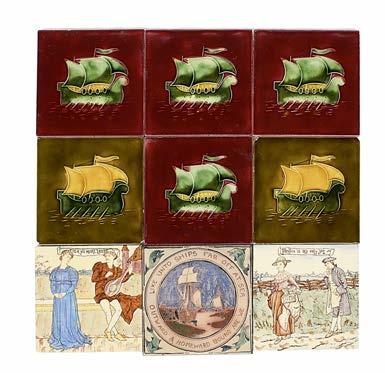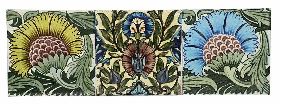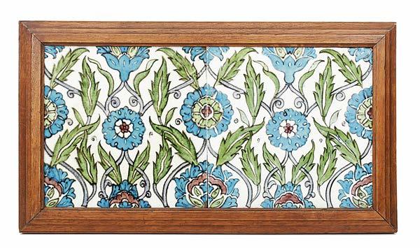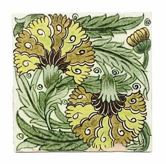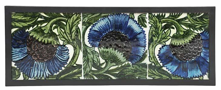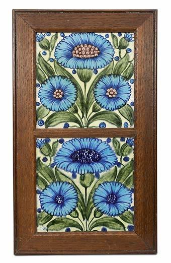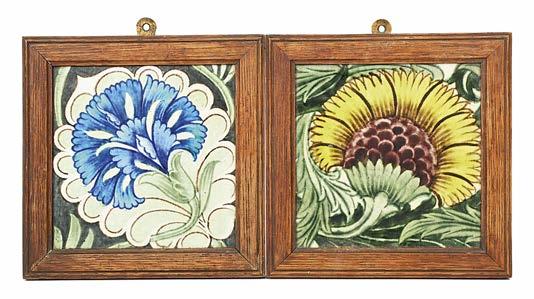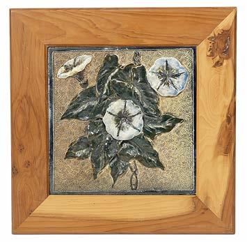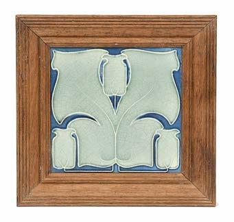 A Martin Brothers stoneware tile by Robert Wallace Martin, modelled in low relief with convolvulus flowers, glazed green, blue and white on a textured mushroom ground, framed by Peter Cornish, marks concealed, 15cm. square