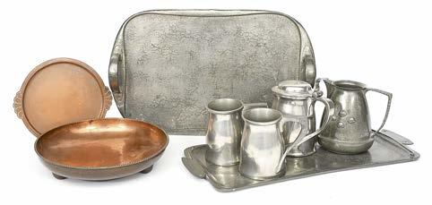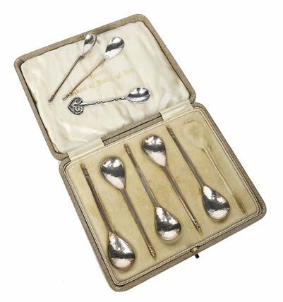 A Keswick School of Industrial Arts part set of silver tea spoons, five spoons with hammered bowls, in fitted case, two smaller examples and another Keswick silver spoon, four Keswick caddy spoons, a silvered metal jug in the manner of C.F.A. Voysey, and nine various Arts and Crafts door plates, stamped marks Chester, 1915, 18.5cm. high (jug) (22)