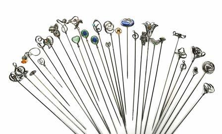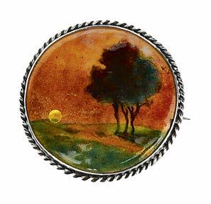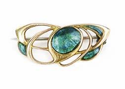 A Charles Horner Medieval Revival silver brooch, circular with wirework decoration, set with amethyst cabochon, another set with abalone shell panel, three Varco Real Ruskin Ware brooches, a buckle brooch in the manner of the Guild of Handicraft set with enamel Galleon roundel, and eight other brooches, stamped CH shield to main, 3.8cm. diam. (14)
