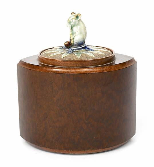 An early Martin Brothers stoneware caddy by Robert Wallace Martin, cylindrical form, modelled in low relief with panels of horses grazing and resting, in ochre, blue and white on a mushroom ground, with turned wood cover by Peter Cornish, incised R W Martin Southall, filled chips to top rim, 14cm. high (2)