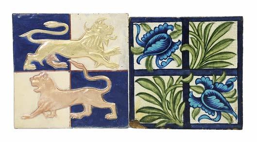 A pair of Martin Brothers stoneware tiles, each incised and painted with scrolling foliage issuing a grotesque dragon, in buff and chestnut, one signed to edge, minor chips and firing cracks to rims, 15cm. square (2)