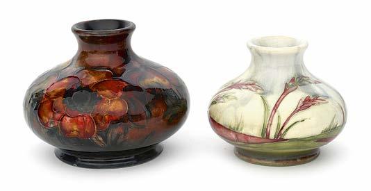 A Martin Brothers stoneware gourd vase by Robert Wallace Martin, shouldered, square section, modelled with swag ribs, covered in a green glaze, and another smaller Martin Brothers stoneware gourd vase, incised R W Martin & Bros, Southall, 18cm. high (2)