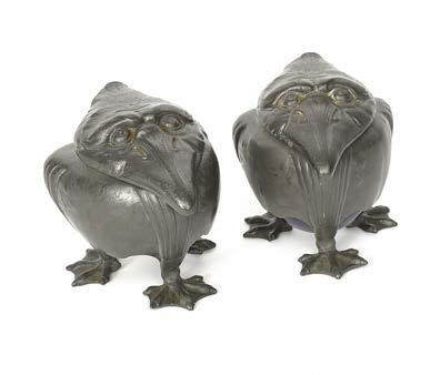 A Martin Brothers stoneware bird jar and cover by Robert Wallace Martin, dated 1897, modelled with broad beak, staring forward with slightly tilted head, with webbed feet, glazed in shades of green, ochre and buff with blue highlights to the wing feathers, incised Martin Bros, London & Southall, 5-1897, minor frit chips, 20.5cm. high