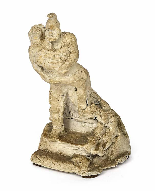 A rare Martin Brothers stoneware sculpture of a fireman rescuing a lady by Robert Wallace Martin, the stoneware maquette biscuit fired, unsigned, exhibition paper label, 10cm. high