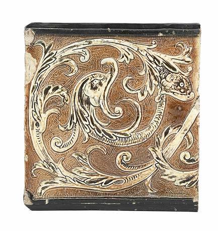 A Martin Brothers stoneware Dragon tile, incised with an entwined dragon, glazed chestnut on a buff ground, impressed marks to back, incised Martin Bros, 14.5cm. square