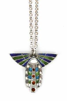 A Liberty & Co silver and enamel Egyptian Revival pendant necklace, modelled as a winged scarab, enamelled blue, green and red stamped marks, 2.5cm. high