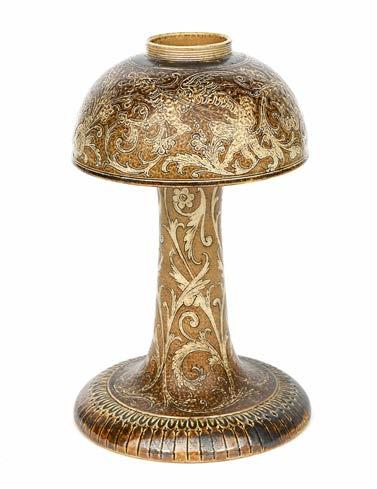 A Martin Brothers stoneware oil lamp base by Edwin & Walter Martin, dated 1888, swollen form on flaring conical base, incised with a figure holding a chained dragon whilst two other young men ride dragons, in a scrolling foliate ground, glaze ochre and tan, the stem with scrolling foliage, incised 1-1888 Martin Bros London & Southall, firing crack to base, 24cm. high