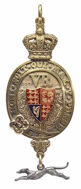 A Victorian Queen’s Messenger’s Badge, silver, silvergilt and enamel, the oval badge bounded by a garter, enamelled arms to the centre within a relief engraved wreath and under the VR cyper, crown suspension with a loose ring, below the badge a pendant silver greyhound running left, London 1875, good very fine or better