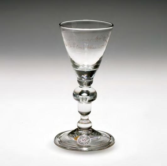 Four cordial glasses from this set are recorded and are believed to have been commissioned by either Patrick Wilson, a customs collector in Aberdeen, or his son, George Wilson, a prominent barrister at Lincoln’s Inn.