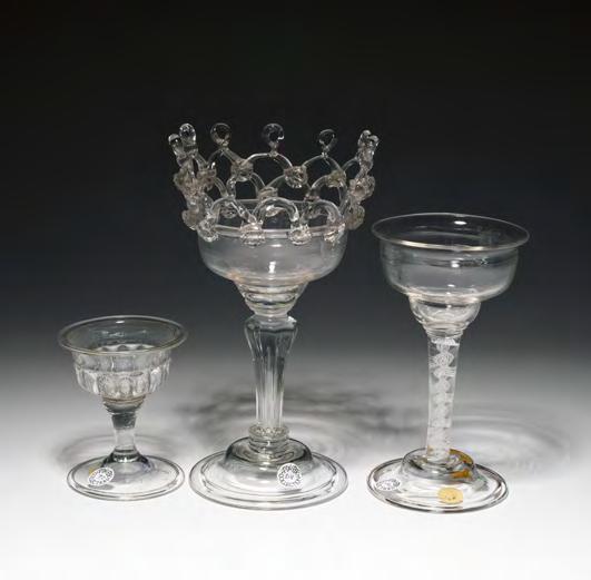 27 Three sweetmeat glasses, c.174060, one with an ogee bowl raised on an opaque twist stem and domed folded foot, another with an elaborate doublehooped rim applied with prunts over a Silesian stem and domed folded foot, and a small sweetmeat or mead glass with moulded gadrooning on a plain stem and folded conical foot, a section of the hooped rim lacking, 20.5cm max. (3)