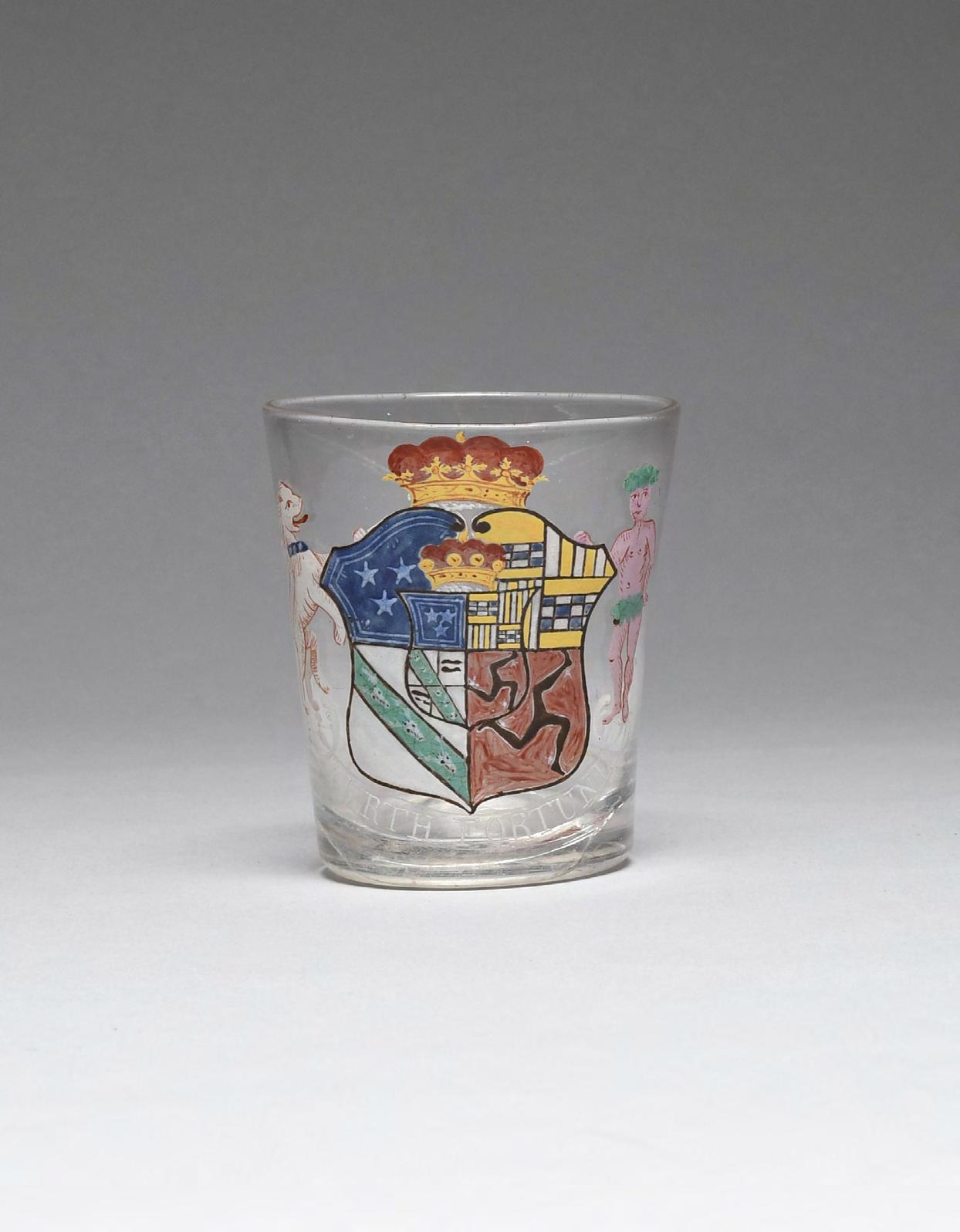 A rare enamelled armorial glass beaker or tumbler, dated 1767, decorated in bright colours with the arms of John Murray, 3rd Duke of Atholl, the reverse with the date 1767, the base broken out and restuck, 9.5cm.