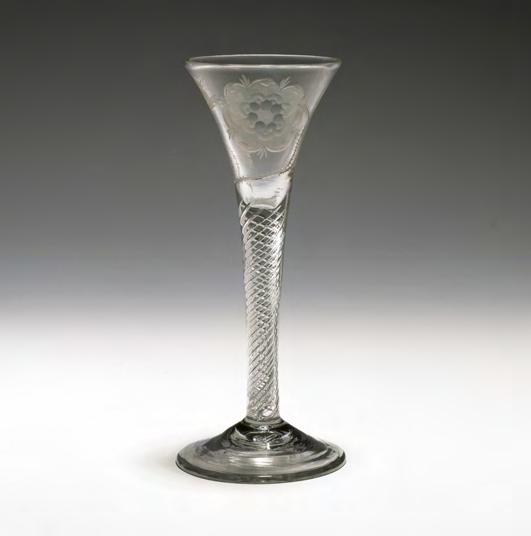 49 A Jacobite wine glass, c.1760, the drawn trumpet bowl engraved with a sevenpetalled rose with two buds, raised on a dense airtwist stem above a conical foot, 17.5cm.