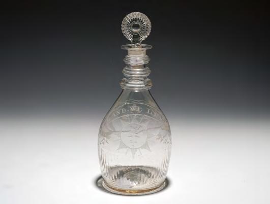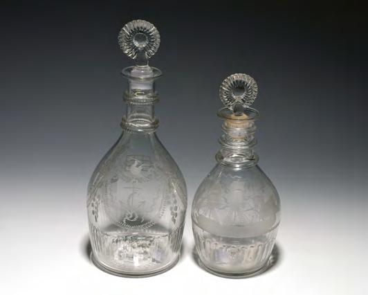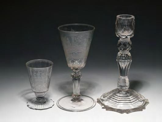 56 A commemorative glass tumbler or beaker, early 19th century, the flared form engraved with a ship at sail within a banner inscribed ‘The Venerable Adml Duncan Octbr 11: 1797’, within sprays of hops and barley, the reverse with the initials ‘JD’ within berried swags, 10.3cm. £500700 Adam Duncan, 1st Viscount Duncan (1731-1804) was promoted to Admiral in 1795. His victory against the Dutch at Camperdown in October 1797 was the most significant battle between the Dutch and the English during the French Revolutionary Wars.