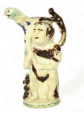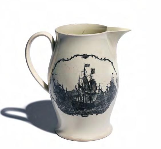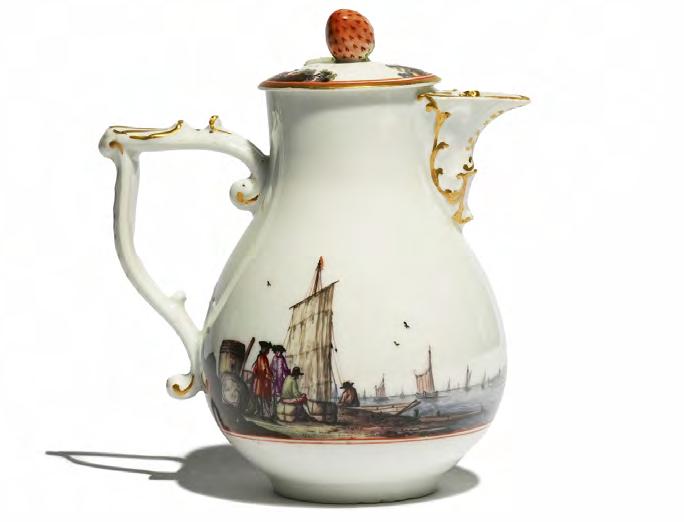465 A Meissen jug and cover, c.174550, the baluster form painted with a continuous kauffahrtei scene of figures beside barrels on the shore with ships and other sailing vessels beyond, the cover with a strawberry finial, blue crossed swords mark, 13.5cm. (2)