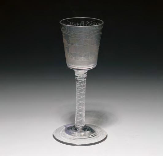 47 A rare Privateer wine glass, c.174550, the bucket bowl engraved with a threemasted ship at sail beneath the inscription ‘Success to the Tygress Privateer’, raised on a double series opaque twist stem over a conical foot, 16cm.