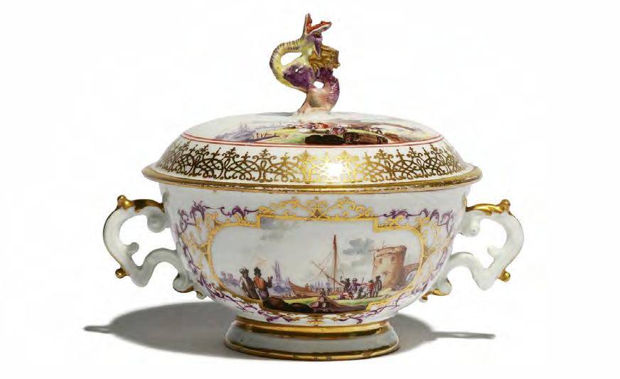 464 A good Meissen ecuelle and cover, c.1735, the twohandled form painted with panels of figures in landscapes and harbour scenes within laub und bandelwerk borders enclosing Böttger lustre, the cover with further kauffahrtei scenes and a dragon finial, blue crossed swords mark, gilder’s mark, 15.3cm across. (2)