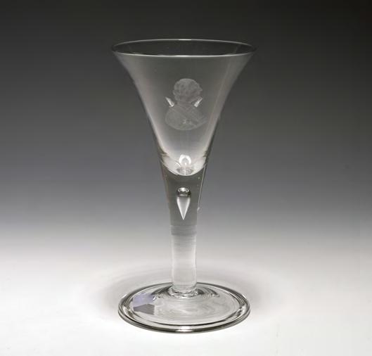 51 A large and rare wine glass of Scottish Jacobite significance, c.1750, the drawn trumpet bowl engraved with a profile portrait of Prince Charles Edward Stuart (Bonnie Prince Charlie) wearing a sash and garter star, raised on a plain stem enclosing a single tear, over a folded conical foot, 19.7cm.