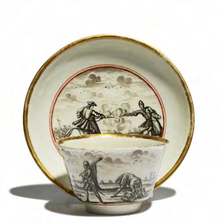 461 A Du Paquier teabowl and saucer, c.1725, well painted in schwarzlot, the saucer with a pistol skirmish on horseback, the teabowl with the aftermath of a battle, the interior with a flower spray, 12.2cm. (2)