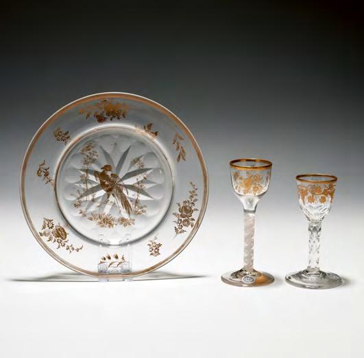 21 A rare glass plate, c.1770, gilded probably in the atelier of James Giles with a longtailed bird flanked by trees, the rim with flower sprays, with two small wine glasses with floral and grapevine decoration in gilt, one raised on an opaque twist stem, the other on a faceted stem, one foot chipped, 22.5cm. (3)