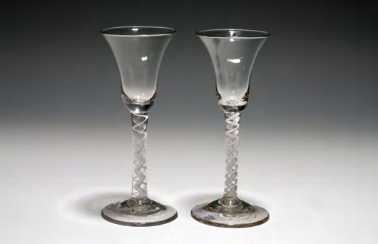 11 A matched pair of mixed twist wine glasses, c.1760, with bell bowls raised over stems enclosing an opaque band entwined with an airtwist cable, 17.5cm. (2) £200300