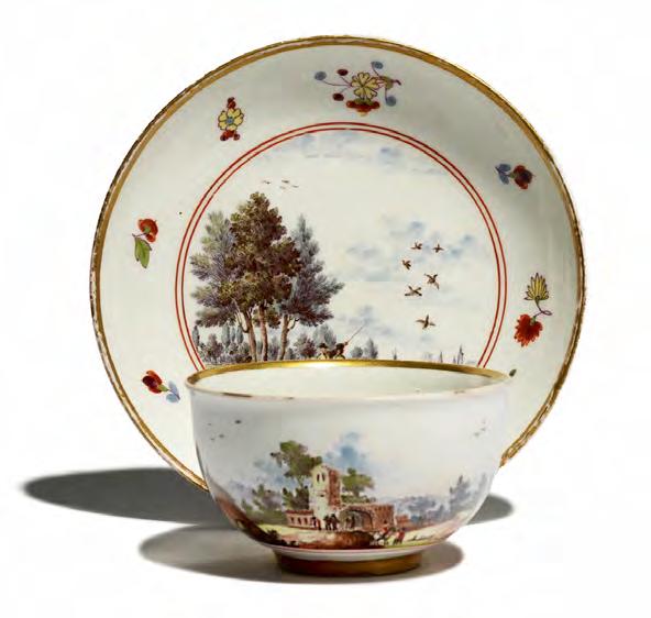 468 A Meissen teabowl and saucer, c.173035, the teabowl’s exterior painted with a continuous scene of figures on a lake and before buildings, the interior with a spray of Indianische Blumen, the saucer with figures beside a lake or river with birds in flight above, the rim with further Kakiemon flowers, blue crossed swords marks, gilder’s mark B, 13cm. (2)