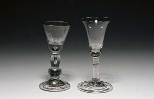 22 Three wine glasses, c.174060, one with a round funnel bowl with solid base raised on a moulded square section stem and folded foot, a light baluster glass with upper and basal knops on a domed foot, and a deep glass or goblet, probably Continental, with an ogee bowl over a baluster stem and conical foot, a small chip to one foot, 16.6cm max. (3) £200300