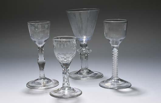 24 Five small wine glasses, c.176080, with round funnel and ogee bowls, one engraved in the Jacobite manner with a rose and butterfly, another cut with a rose and raised on a faceted stem, one engraved with an armorial shield inscribed ‘Ossac’, two moulded bowls raised on multiseries opaque twist stems, some footrim nibbles, 16.2cm max. (5) £150250