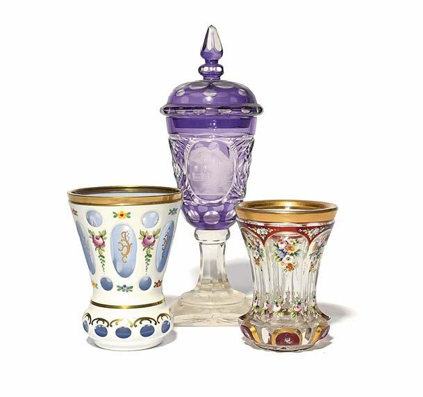 7 Three sweetmeat glasses, c.175060, one with an ogee bowl with a shaped rim, another with a shallow bowl cut with oval designs, both on moulded Silesian stems over shaped domed feet, the third glass with a heavily cut thistle bowl raised on a faceted stem and cut domed foot, 16.8cm max. (3) £150250