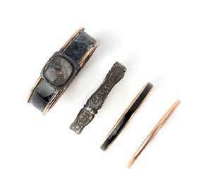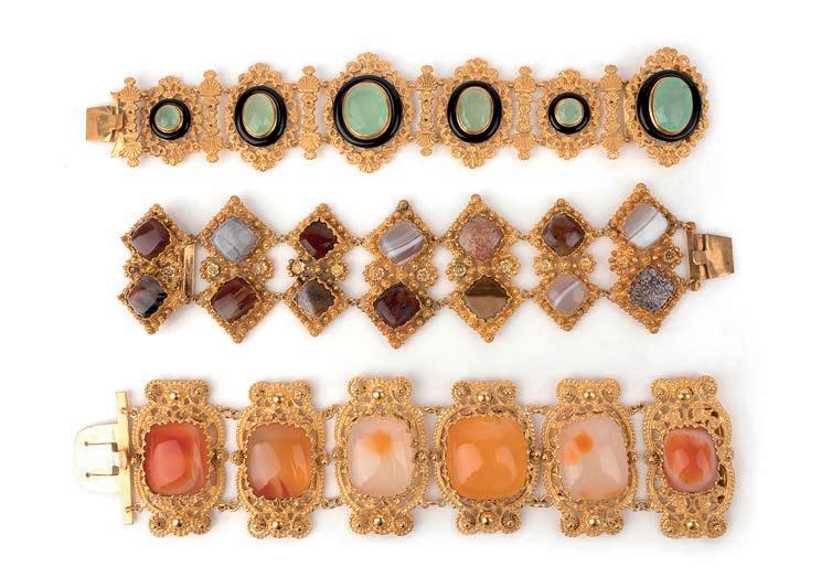 Three hardstone bracelets, mid 19th century, comprising: a bracelet set with oval chrysoprase bordered by black enamel and stamped gilt metal mounts, length 18cm; a bracelet set with agate and jasper, to gilt metal mounts with cannetille accents, length 17cm; and a gilt metal bracelet set with carnelian cabochons, length 18cm £200300