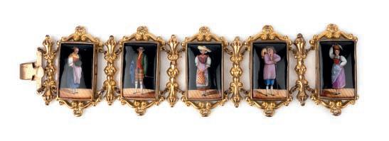 1026 A mid 19th century metal bracelet, set with five rectangular panels depicting typical Swiss dress, in yellow metal surround, length 19.5cm £200300