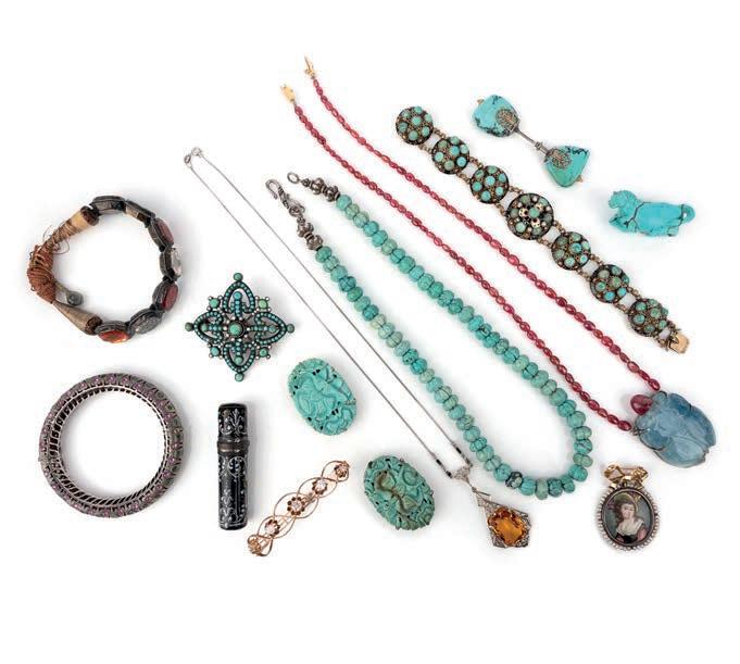 1015 A mixed group of jewels and accessories, comprising: a gold bangle set with cushionshaped and brilliantcut diamonds, fitted case; a Chinese blue tourmaline snuff bottle carved as two cicadas, to a pink tourmaline stopper, mounted as a pendant suspended from a spinel bead necklace; an enamelled cylindrical perfume bottle; a pendant set with a cushionshaped orange paste and rosecut diamonds; an emerald and ruby bangle; an Indian bracelet set with foilbacked paste; an enamelled miniature suspended from a bow surmount, bordered by seed pearls; and a collection of turquoise jewels including a necklace, a pair of carved slides, a bracelet, a brooch, a jabot pin, and a small Chineseinspired horse carving £200300 Provenance: The snuff bottle: The Country House sale, property from the 14th Earl of Kintore and the late Edward Lyons CBE, Christie’s South Kensington, 18th March 2009, lot 220.