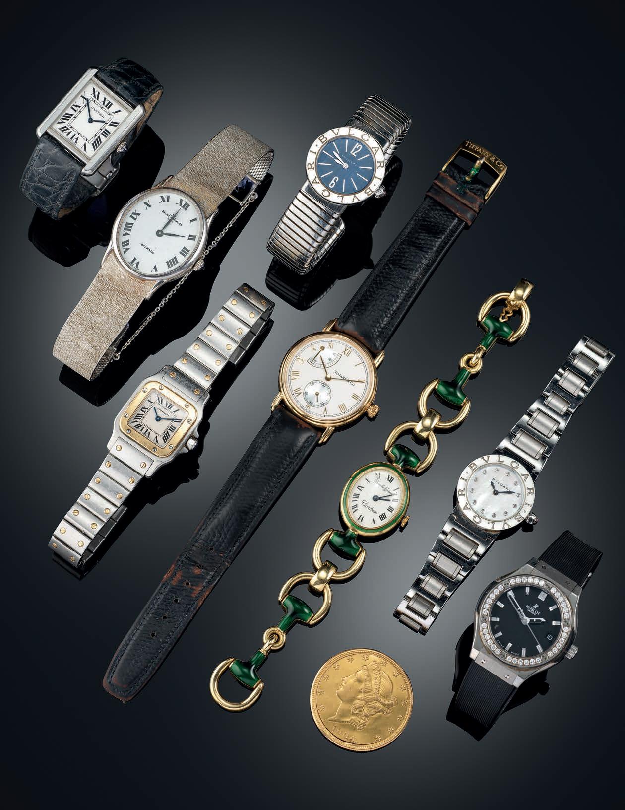 1040 A group of signed watches and accessories, comprising: a stainless steel ‘Heure H’ watch by Hermès, ref. HH1.510, box and papers; a silver and blackened steel torque bangle by Paloma Picasso for Tiffany & Co., case and pouch stamped Tiffany & Co.; two Gucci watches and a Gucci lighter, two cases stamped Gucci; together with a pair of hinged enamel and gold bangles, in red and green respectively, unsigned, stamped 750 £200300