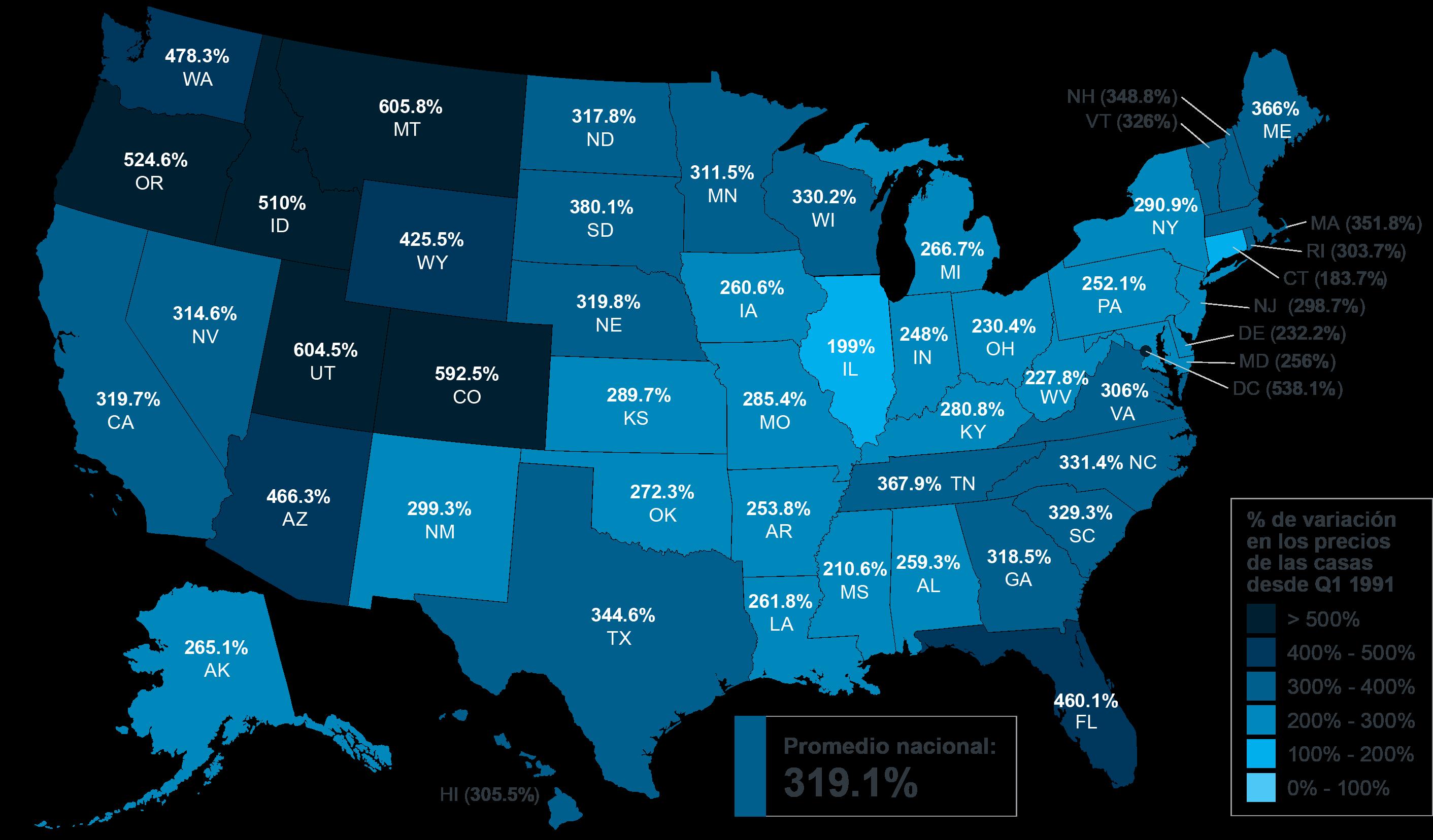 He aquí un vistazo a cómo solo la parte de la apreciación del precio de una casa puede aumentar su patrimonio con el tiempo. Cambio porcentual en los precios de las casas