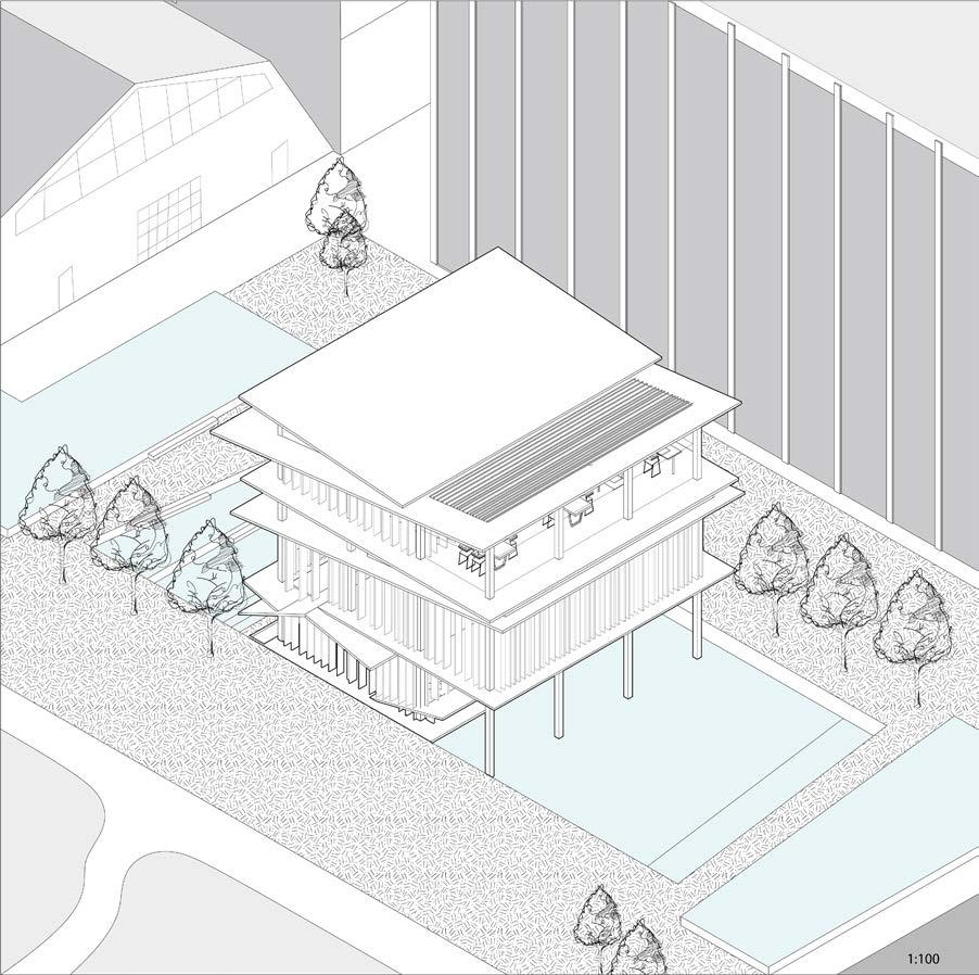 At its core, this project challenges the conventional role of a study center’s facade by strategically placing panels at varying distances throughout the building. This deliberate placement serves as a mechanism to artfully manipulate the influx of natural light into interior spaces, affording students the unique opportunity to curate their study environment throughout the day. The thoughtful incorporation of these panels isn’t confined to the exterior; it continues into the interior of the building. This intentional continuity extends beyond functional utility, creating a dynamic and playful atmosphere that resonates with students, offering solace during stressful times.