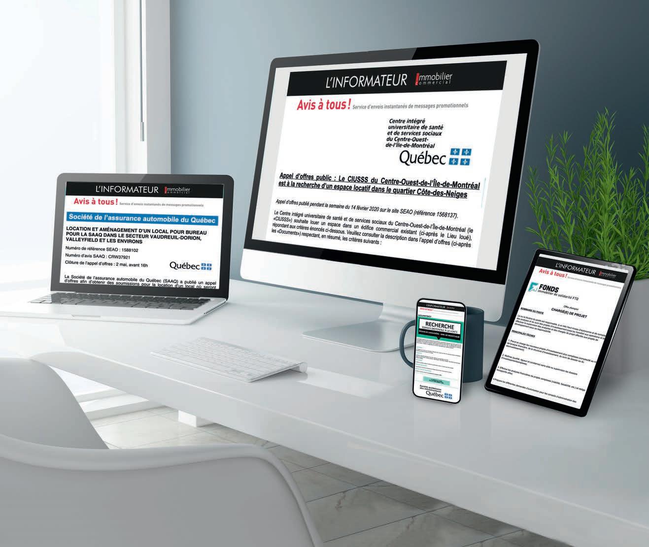 Pour vos appels d’offres ou vos invitations à soumissionner qui peuvent intéresser les grands développeurs immobiliers du Québec, les courtiers immobiliers commerciaux de haut niveau, les grands propriétaires et les leaders du secteur de l’immobilier commercial, utilisez notre service d’envois instantanés de courriels ciblés AVIS À TOUS !