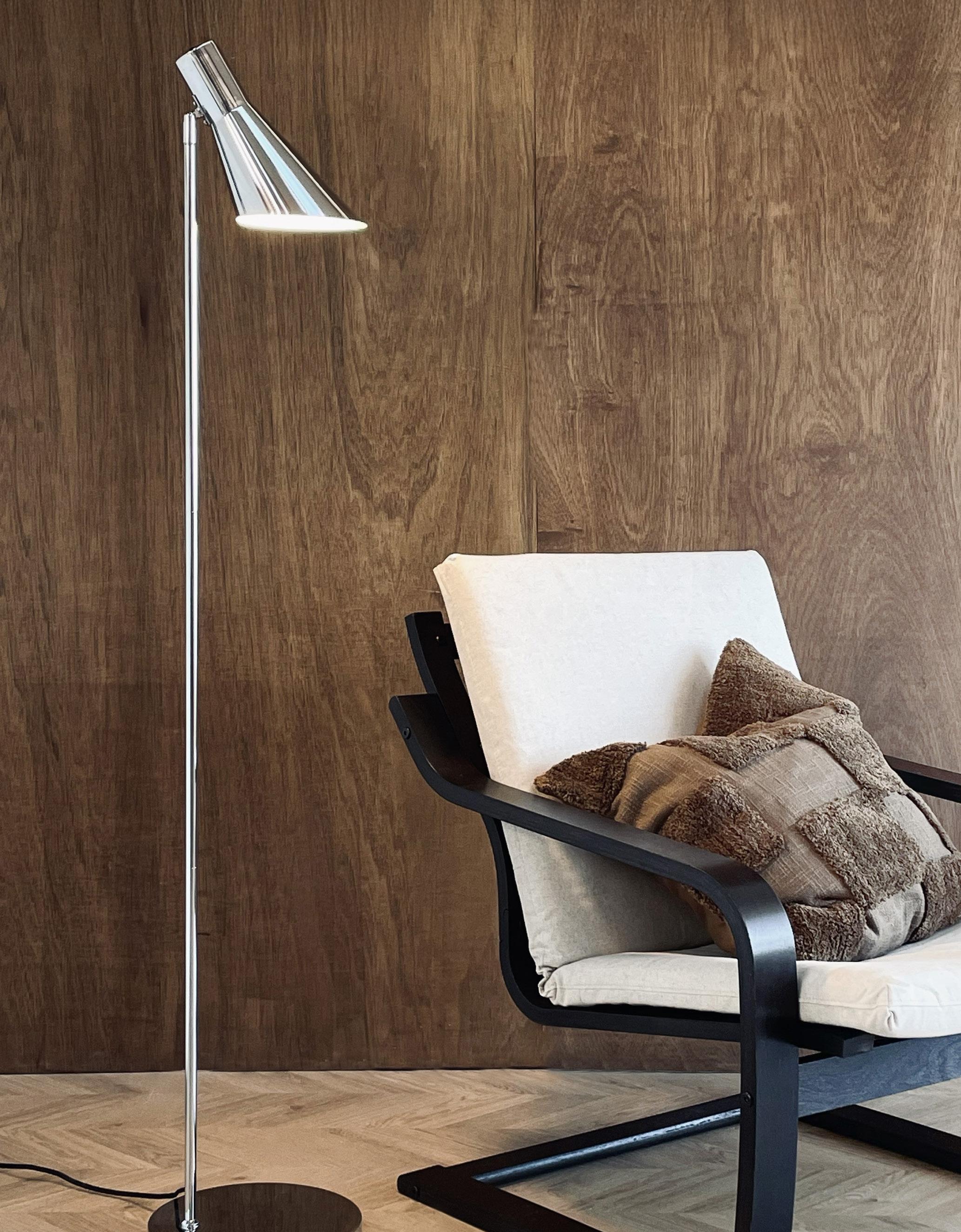 DL12 gulvlampen i krom kombinerer funktionalitet med et stilrent og moderne design. Skærmen kan både drejes og vippes, så du nemt kan justere lyset efter behov. Tænd/sluk-knappen er diskret integreret på skærmen for en enkel og praktisk betjening. Ledningen er elegant ført ud fra bunden af lampestangen, mens den stabile base fuldender designet. Mål: Ø25 cm. x H135 cm