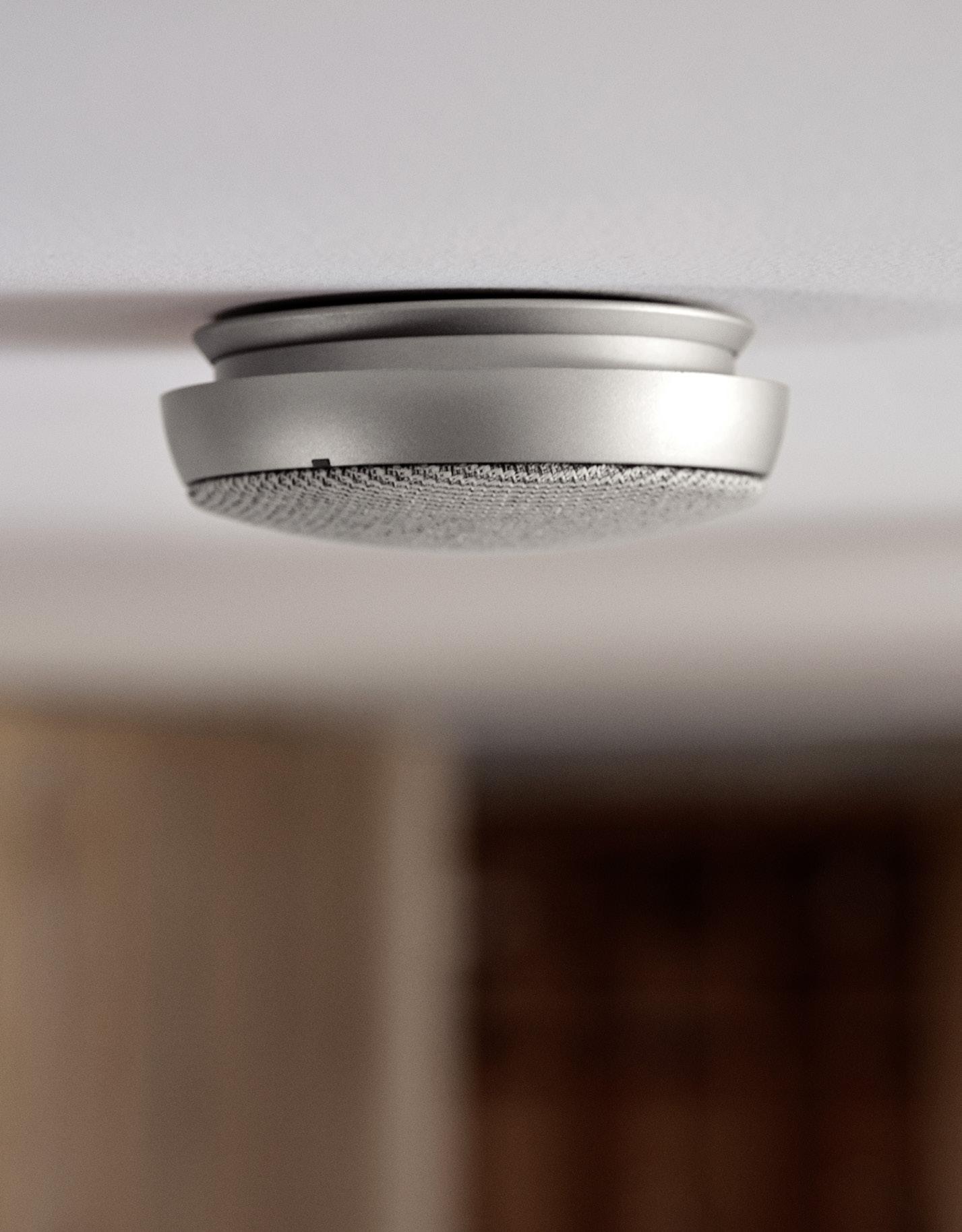 Med et innovativt design giver Jacob Jensen røgalarm dig og din familie beskyttende sikkerhed, samtidig med at den forskønner dit hjem. Røgalarmen bruger en optisk sensor til at registrere røg og har integreret batteri med en levetid på 10 år. Stofbetrækket er 99% genanvendt polyester.