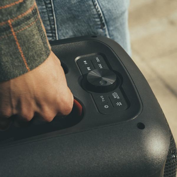 Trådløs og transportabel højttaler i et kompakt design, der leverer kraftfuld lyd med stærk bas. Det integrerede bærehåndtag og den solide ABS-konstruktion gør, at den kan modstå lidt af hvert. Volumen styres nemt fra telefonen eller via knappen på toppen. Her finder du også BASS-boost knappen, når der skal ekstra tryk på bassen. Det indbyggede farverige LED-partylys, som nemt tændes og slukkes på toppen, skaber den helt rigtige party-stemning og med en batteritid på op til 7 timer kan du nyde musikken i lang tid.