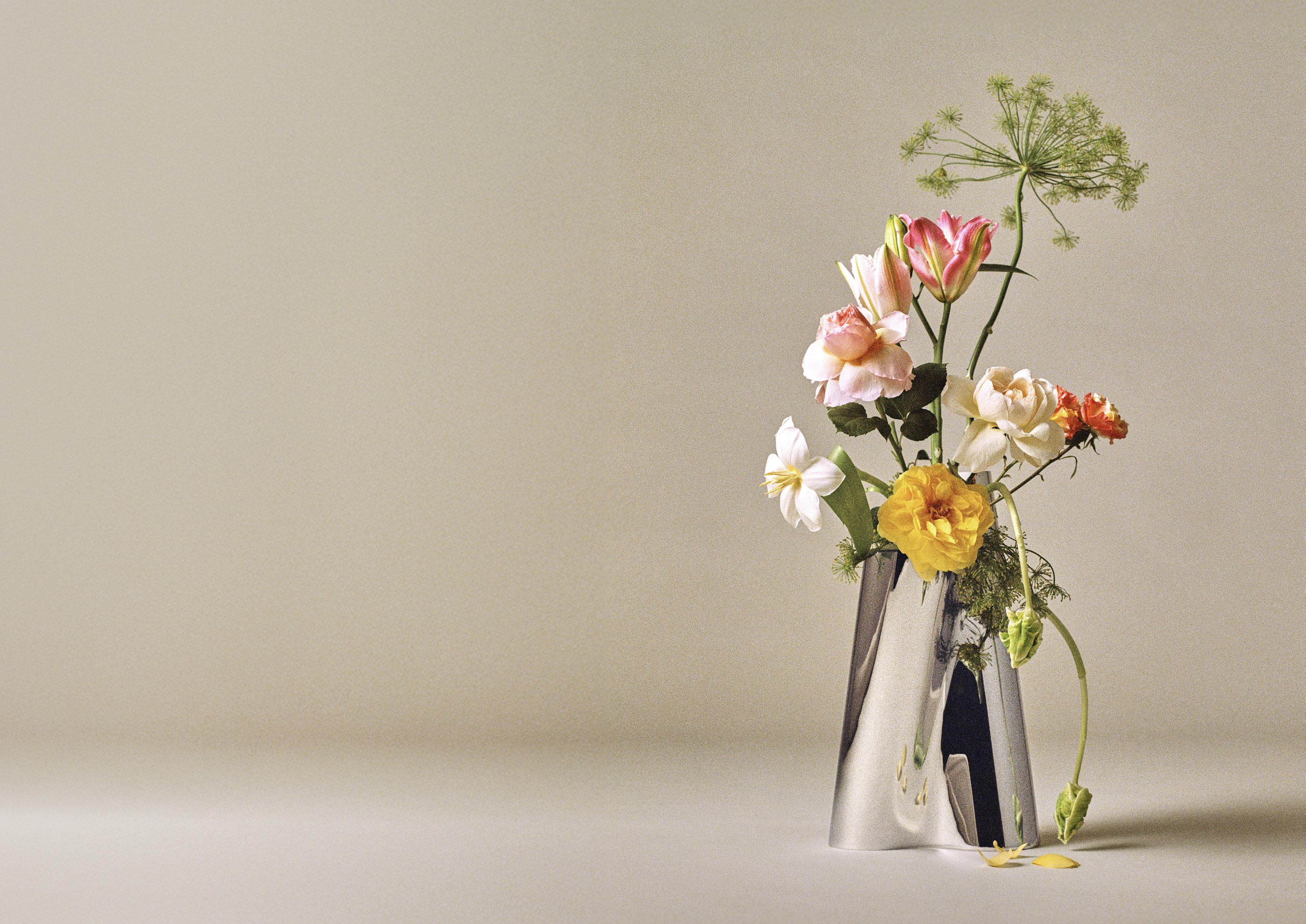 Denne skulpturelle vase er designet af den danske arkitekt og designer Anne Boysen. Vasen er fremstillet i håndpoleret rustfrit stål og har en elegant form i forskellige højder og vinkler, som indbyder til at arrangere blomsterne på kreative måder. Boysens vision var at designe en vase, der støtter blomsten i hele dens levetid. Uanset hvordan blomsterne arrangeres, sørger vasens form for, at det også ser smukt ud, når blomsterne ændrer sig med tiden.