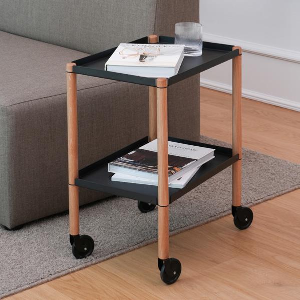 Bakkebordet er designet med to rummelige metalbakker, der giver bordet et elegant og alsidigt udtryk, samt stabile ben i egetræ, der tilfører bordet naturlig varme. Praktiske hjul tilbyder en ubesværet mobilitet, så bakkebordet nemt kan flyttes rundt. Brug den som en stilfuld barvogn, som et alsidigt sidebord i stuen eller en praktisk opbevaringsløsning på kontoret. Størrelse: L 50 × B 35 × H 63 cm
