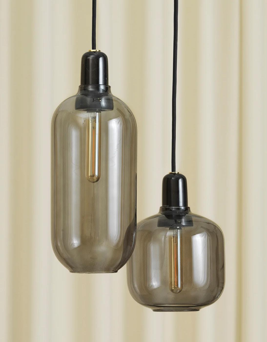 Amp er en serie af lamper inspireret af 1960’ernes hi-fi udstyr. Den unikke form i kombination med glas og marmor giver det moderne design et nostalgisk udtryk. Den dekorative pære giver en smuk glød gennem det røgfarvede glas. Lad dem hænge elegant og let over spisebordet, hæng dem enkeltvis til at oplyse mørke hjørner, eller sæt flere sammen i en klynge af lys.