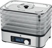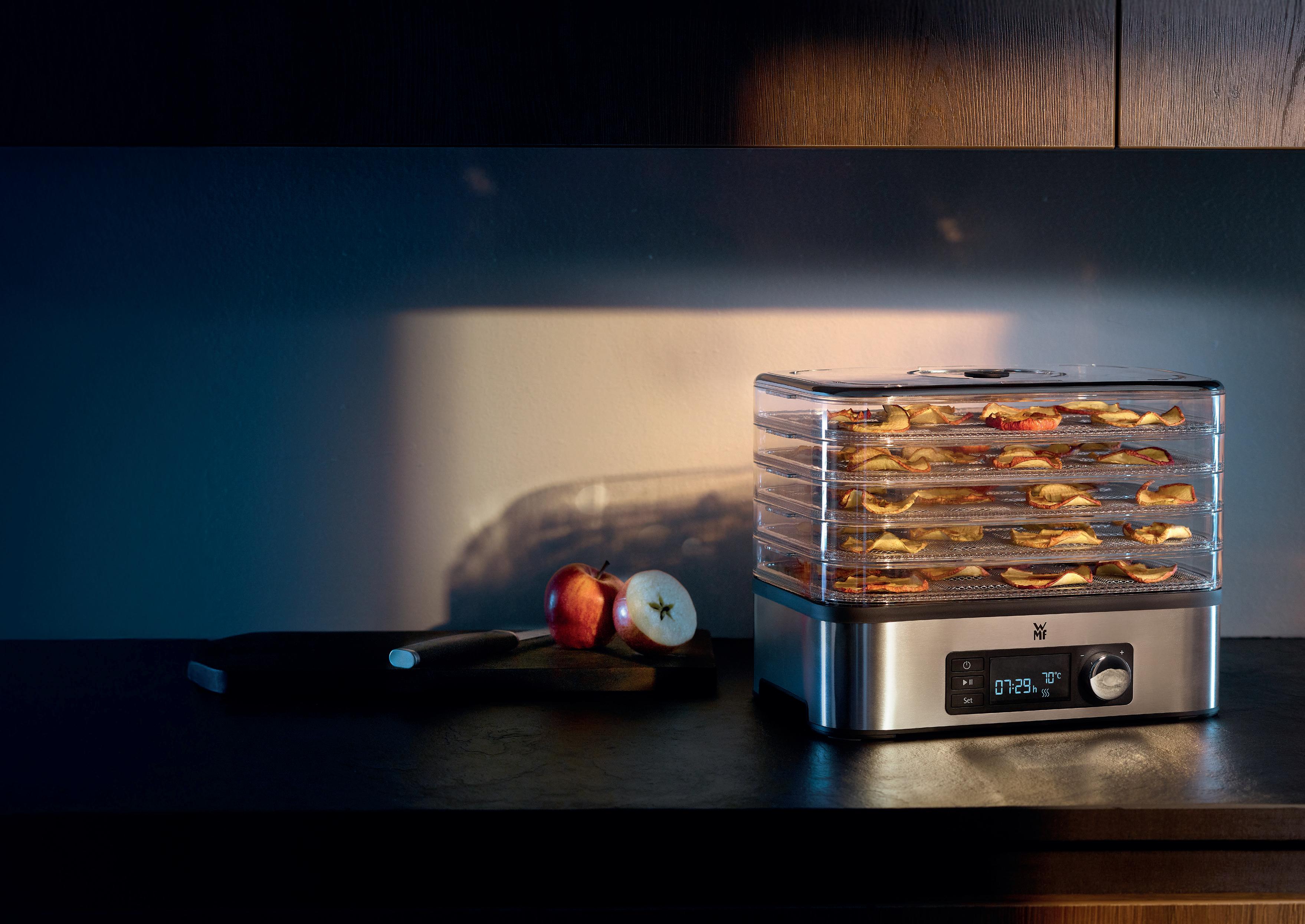 Med WMF Dehydrator Snack To-Go kan du nemt forberede sunde snacks derhjemme. Råmaterialerne bevarer alle vitaminer og smag og er perfekte til dem, der ønsker at tage sig af maden fra naturen. Den er fantastisk til tørring af både frugter, grøntsager, urter og svampe. Med timeren kan du programmere tørringsprocessen op til 24 timer.