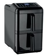 Airfryer med stablede skuffer på tilsammen 11,6 liter giver dobbelt op på muligheder. På den digitale touchskærm kan du vælge mellem 10 forudindstillede programmer. Temperaturen kan justeres fra 80 til 200 °C, og timeren kan sættes til op til 60 minutter. Hver skuffe har en justerbar rist, så du kan lave op til fire forskellige slags mad på én gang. Gennem vinduet kan du holde øje med maden uden at åbne skufferne. 2 x 5,8 liter. 2900 watt.