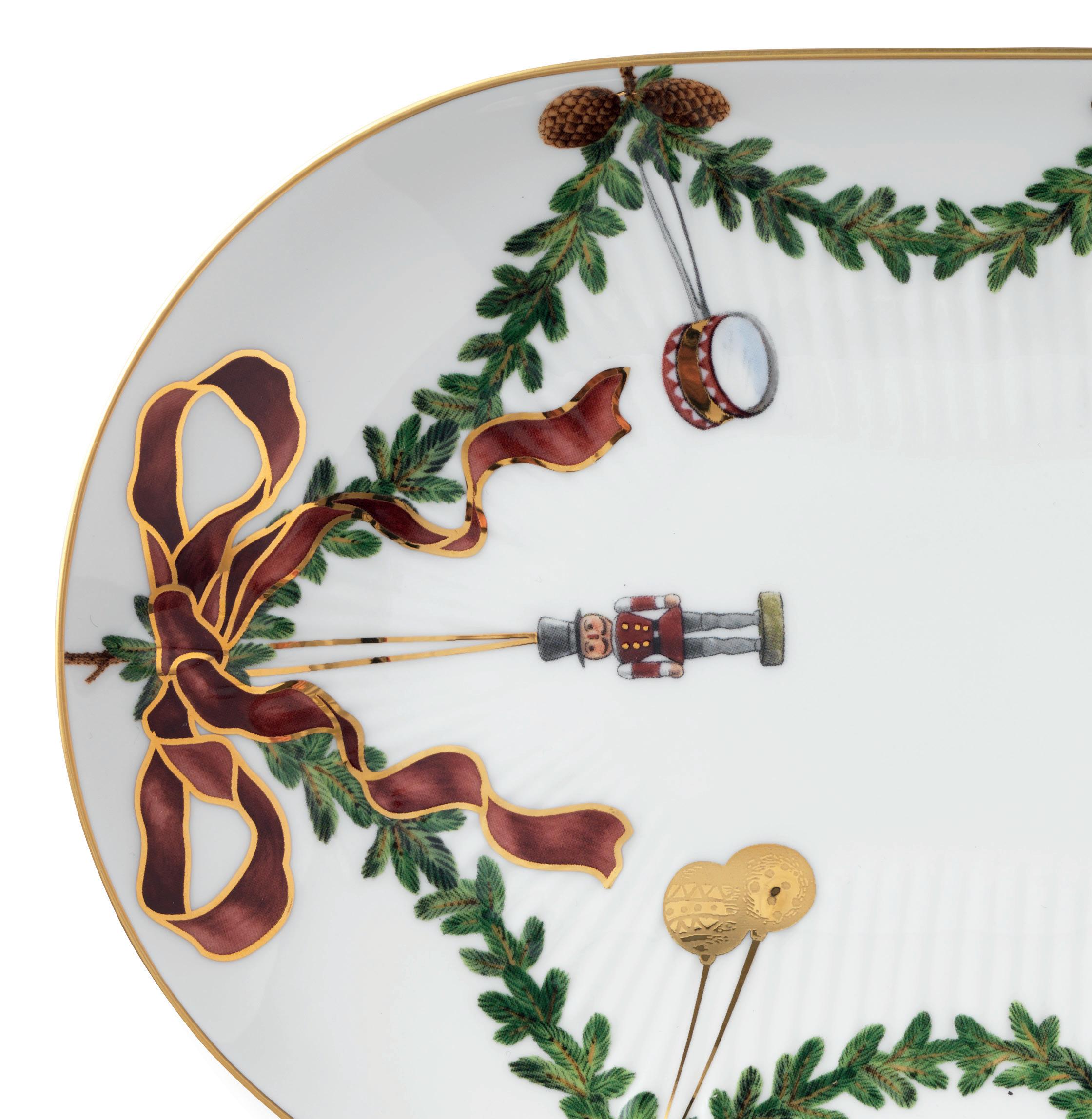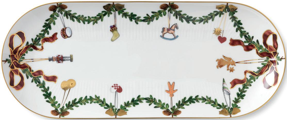 Dette fad er dekoreret med den klassiske dekoration fra Stjerne Riflet Jul, som følger fadets aflange form. Granguirlanden er bundet med fine sløjfer i hver ende og dekoreret med håndplukket julepynt.